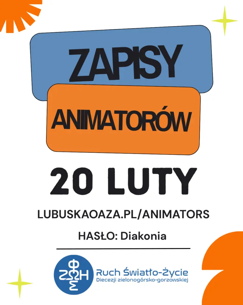 Zapisy animatorów rozpoczynają się 20.02.2026r. roku poprzez system: zapisy.lubuskaoaza.pl/animators /hasło: Diakonia/. Każdy animator, który chce posługiwać podczas tegorocznych oaz (zarówno ci, z którymi rozmawiali moderatorzy, jak i ci, którzy sami chcą zgłosić się na wybraną przez siebie oazę) musi zapisać się przez system. W pierwszym wyborze zaznaczamy preferowaną przez siebie oazę. W drugim wyborze zaznaczamy […]