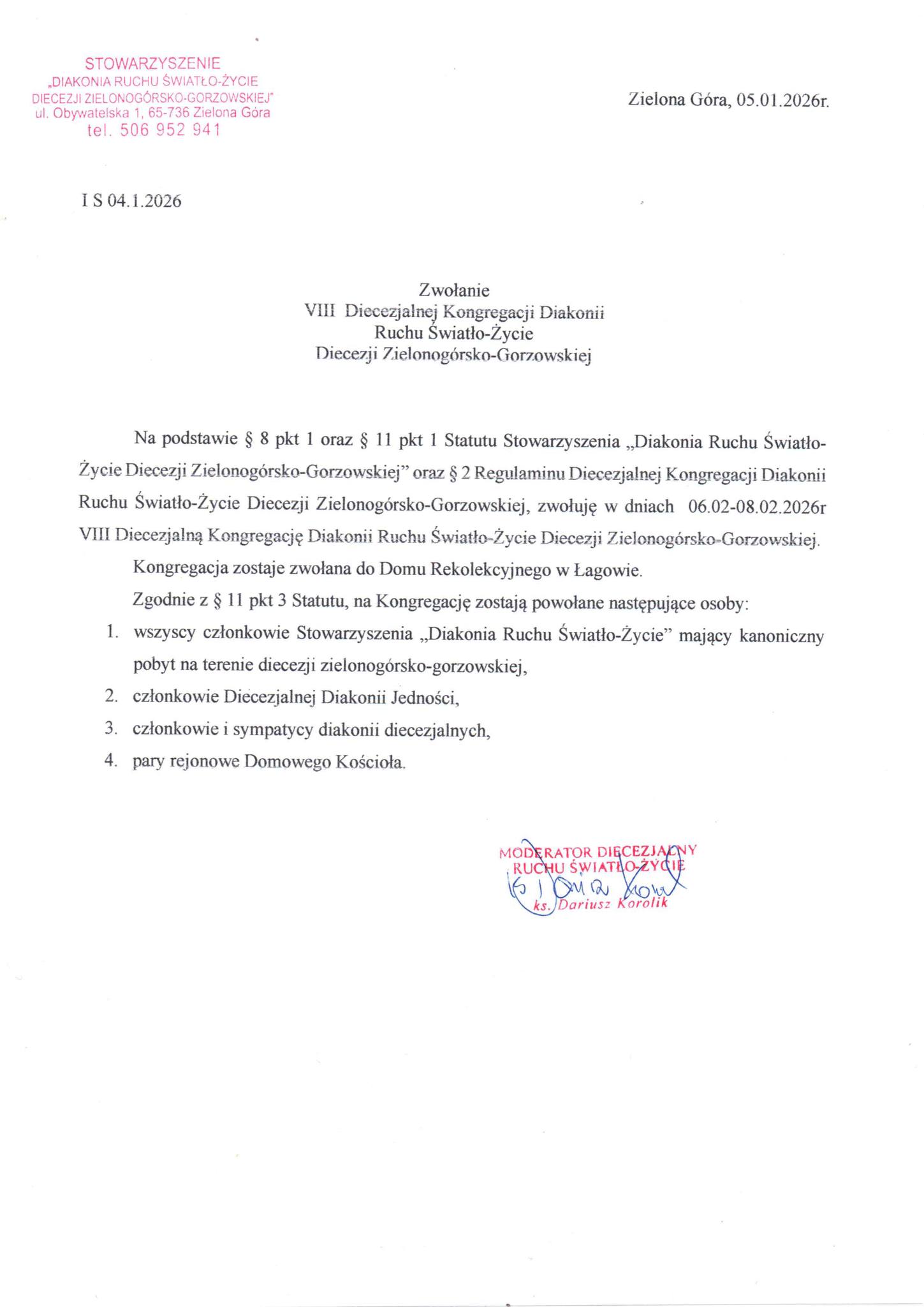 Zapraszamy was do udziału w VIII Kongregacji Odpowiedzialnych „Diakonia – źródła i cele”, która odbędzie się w dniach 06-08.02.2026 w Łagowie Lubuskim. W czasie Kongregacji będziemy chcieli skupić się przede wszystkim na rozeznaniu i przyjęciu na nowo, z miłością szeroko rozumianej diakonii – posługi. Będziemy chcieli wsłuchać się w głos oraz natchnienia Ducha Świętego.